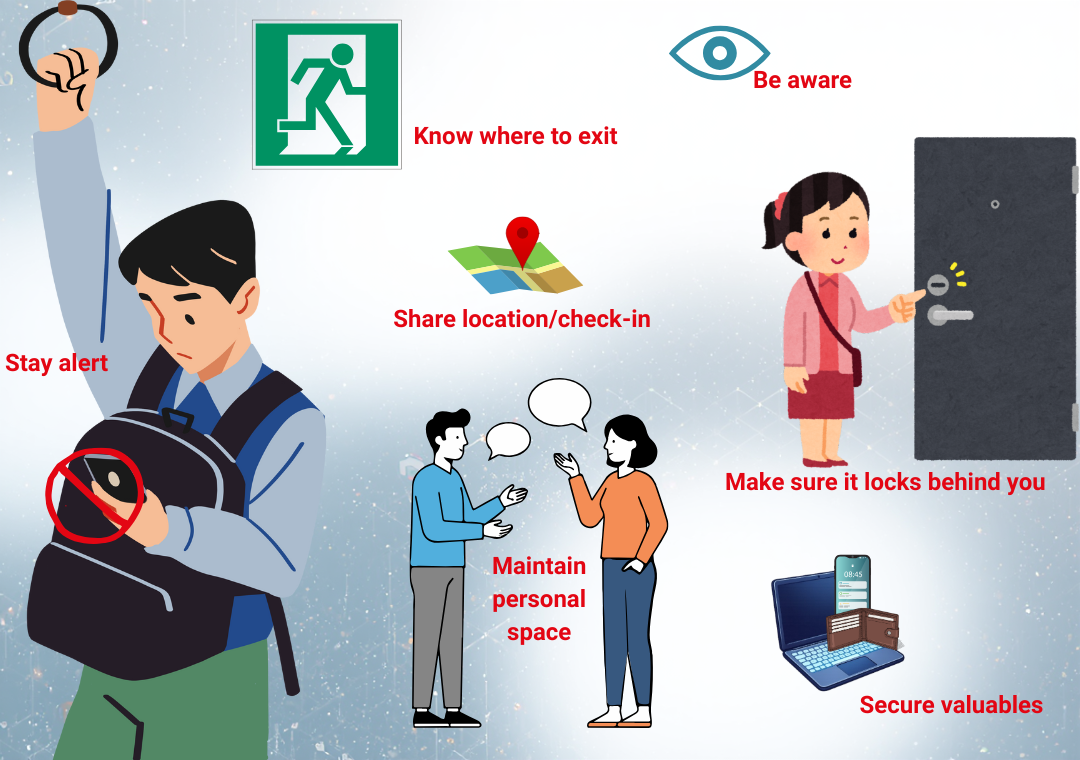 Stay alert and aware of your surroundings; limit headphone and phone use when walking or waiting alone